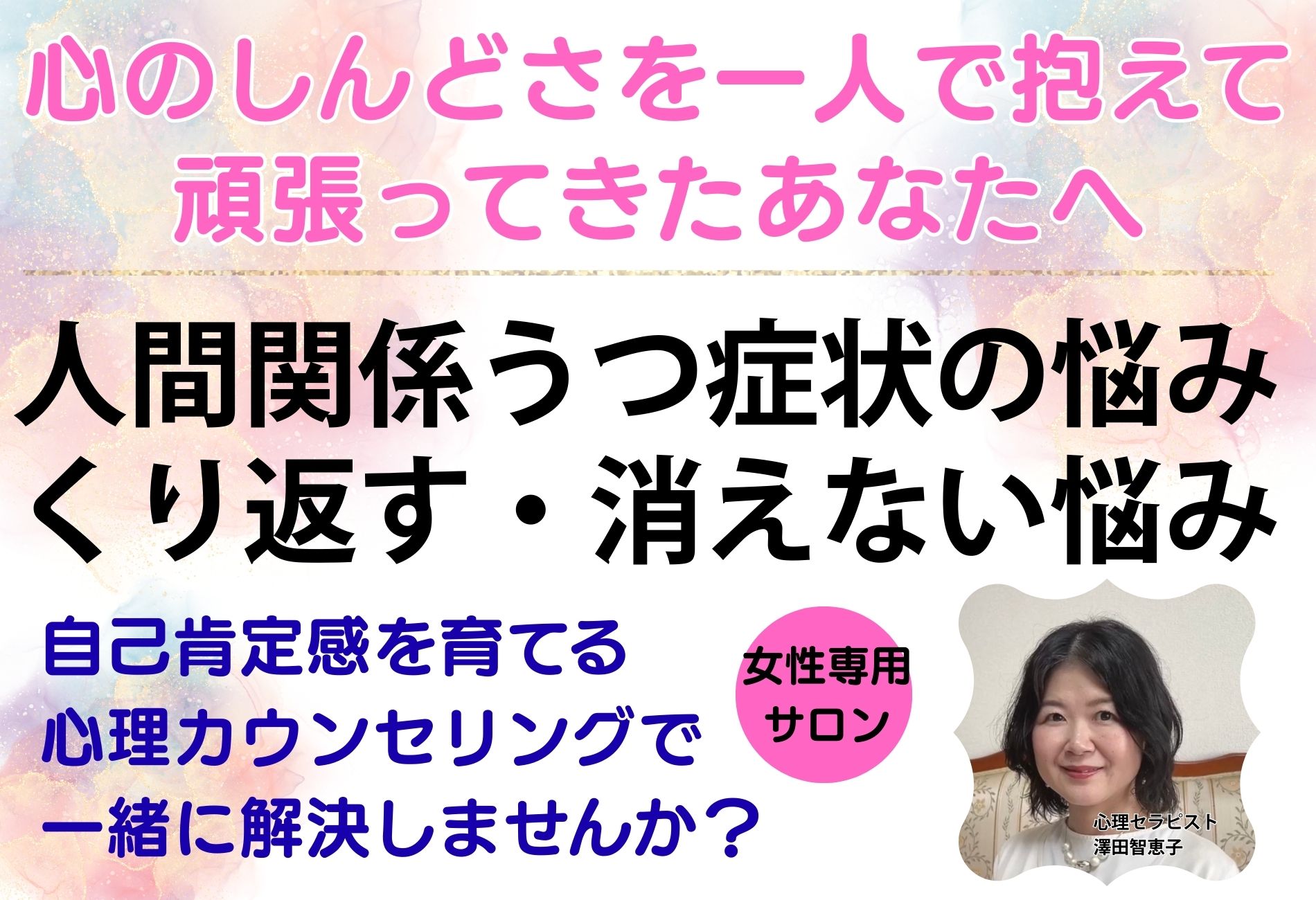うつ症状、人間関係、自己肯定感の悩みの改善 心理カウンセリングサロン「リアルセルフ」澤田智恵子です。