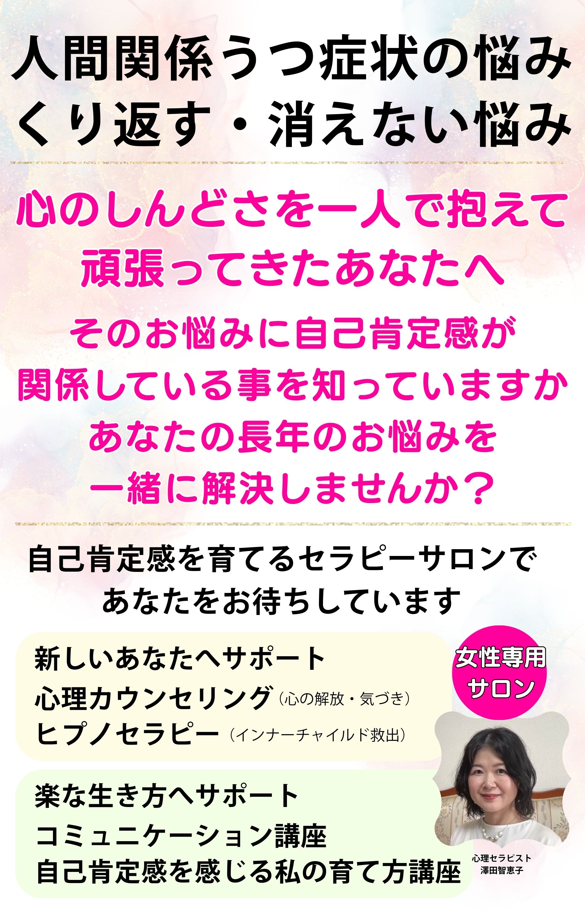 うつ症状、人間関係、自己肯定感の悩みの改善 心理カウンセリングサロン「リアルセルフ」澤田智恵子です。